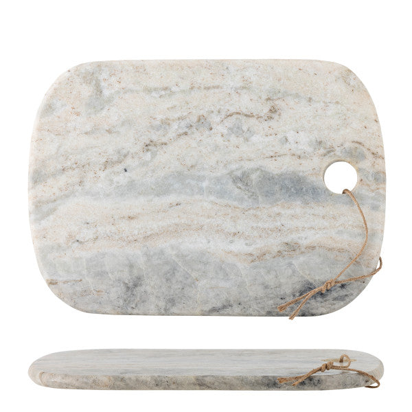 Daska za rezanje Sibelle tvrtke Bloomingville izrađena je od mramora u toplim svijetlim tonovima. Daska ima kožnu vrpcu za vješanje i može se koristiti i za posluživanje i za ukrašavanje. Prirodni materijal osigurava da je svaka daska za rezanje jedinstvena.